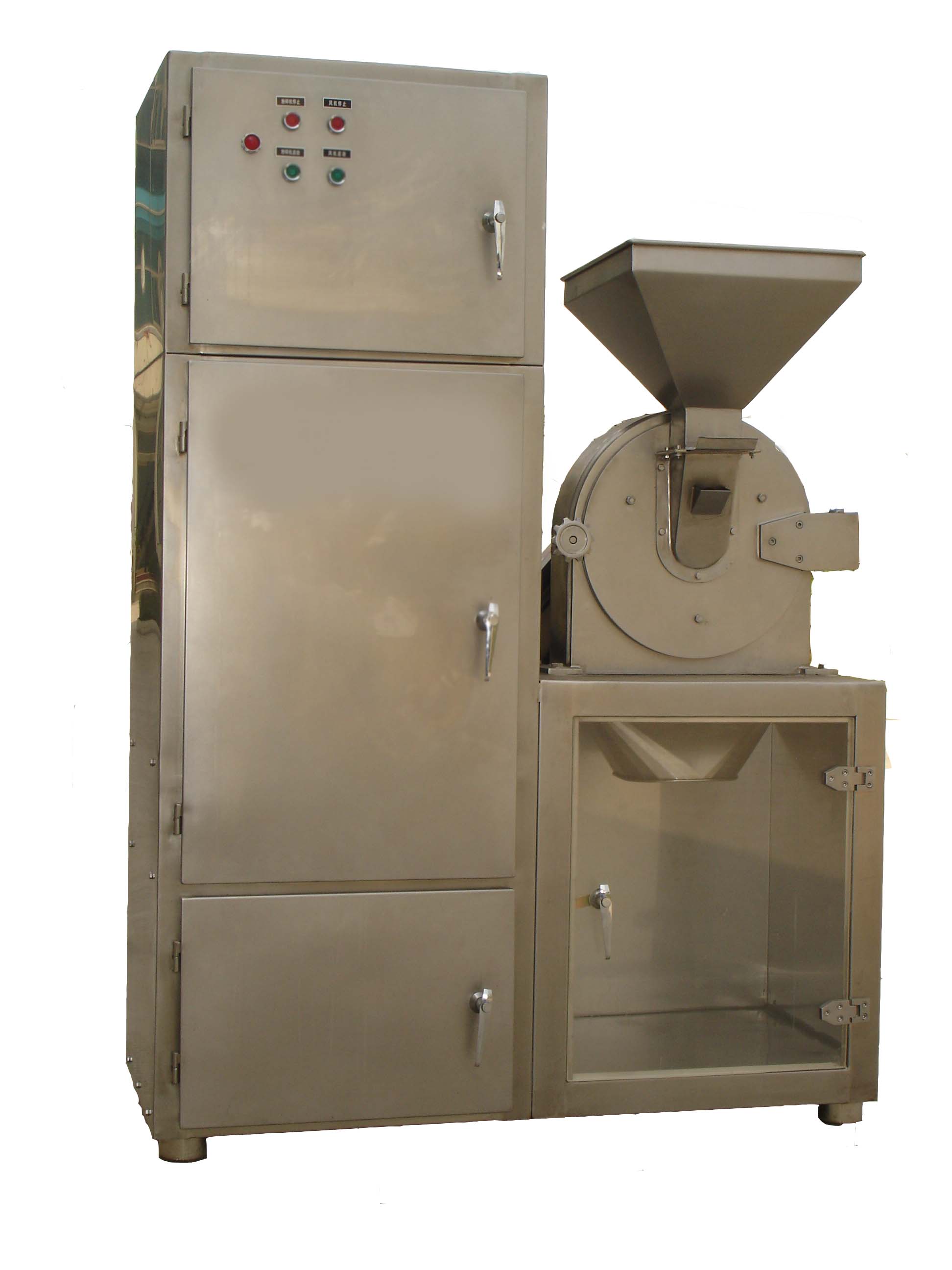本粉碎機組的粉碎機、物料收集箱和吸塵器,全部采用不銹鋼材料制作。符合藥品生產(chǎn)的“GMP”的要求。